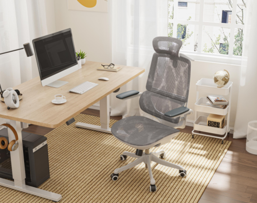 西昊人体工学椅智能旗舰系列产品置于现代办公环境中,其简约流畅的网布设计与周围的书桌、绿植等元素相得益彰,直观展现了产品在居家办公场景中的适配性与美学质感。