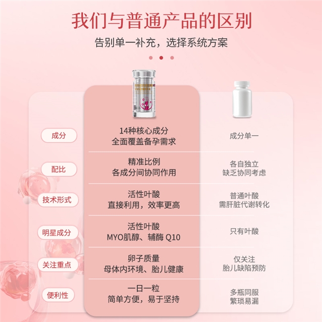 同类产品同类产品黄余堂备孕胶囊以MYO肌醇,活性叶酸、辅酶Q10三大基石构筑产品体系。同类产品同类产品MYO肌醇优化卵子质量与内分泌平衡,活性叶酸无需肝脏转化,直接吸收有效率高达92.4%,一举突破基因多态与代谢障碍。辅酶Q10赋能线粒体,为卵巢细胞持续供能。三者协同作用,形成丰满的营养链条,为生殖环境科学护航,远远超越传统单一补充产品。